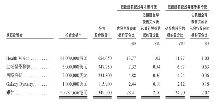 卓正医疗基石投资者分别为Health Vision、金域医学检验、明略科技、Galaxy Dynasty,一共认购9079万港元,其中,Health Vision认购4400万港元,金域医学检验认购300万美元,明略科技认购200万美元,小鹏汽车董事长、CEO何小鹏旗下基金Galaxy Dynasty认购100万美元。